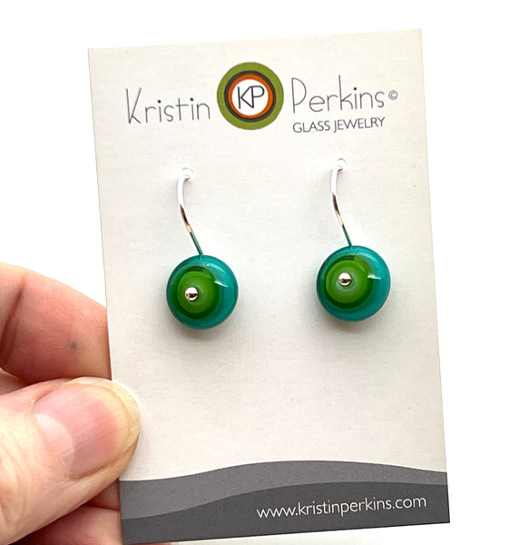 Tiny earrings with a pop of color! Glass are green and teal. I make the flameworked glass disks myself and I also make the sterling silver ear wires.
