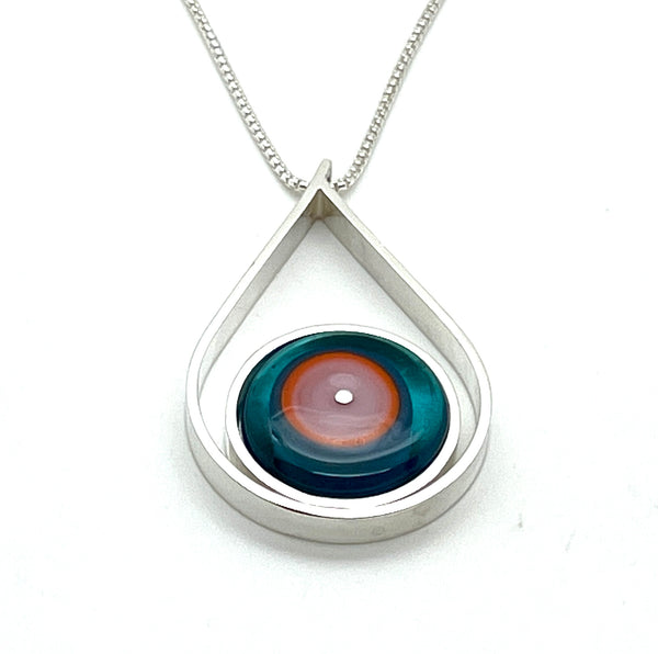 This modern necklace makes a colorful statement! It is shaped like an elegant raindrop with a colorful glass disk set inside.