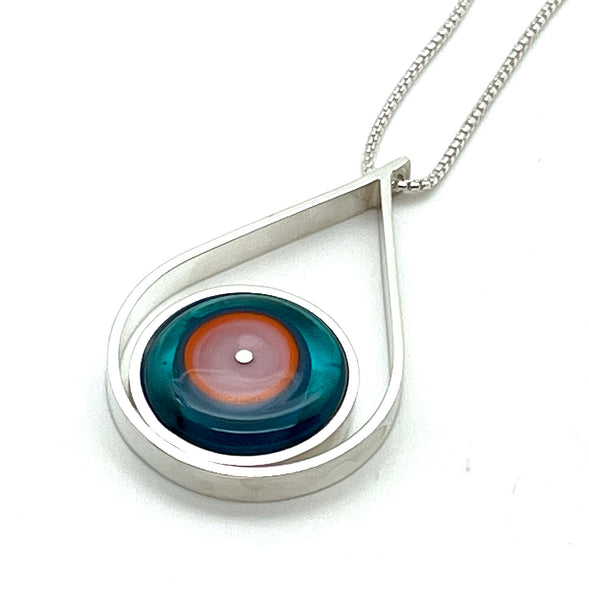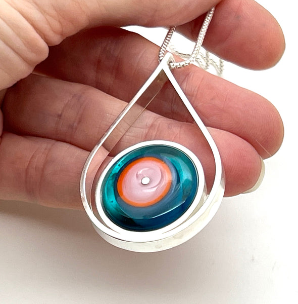 Large Modern Raindrop Necklace in Pink, Orange, and Dark Turquoise Glass and Sterling Silver