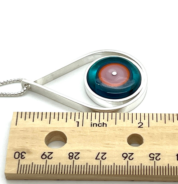 I made the glass in the pendant by melting colorful glass rods with a torch and layering each of the colors as I shape the disk. The glass is annealed in a digitally controlled kiln for strength and durability. I made the sterling silver setting and raindrop shape by fabricating sterling silver sheet.