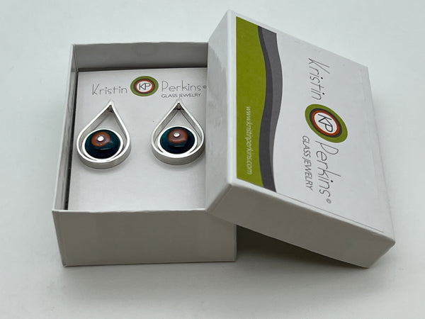 My raindrop shape has been very popular. It is elegant and carefully crafted. I make the glass by melting glass rods with a torch and layering each of the colors. Each piece is made one at a time, freehand without the use of any molds. I make the sterling silver parts by first making a cup setting to fit the glass. Then, I form the raindrop shape from rectangular wire.