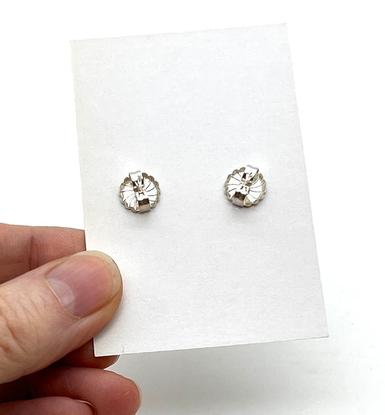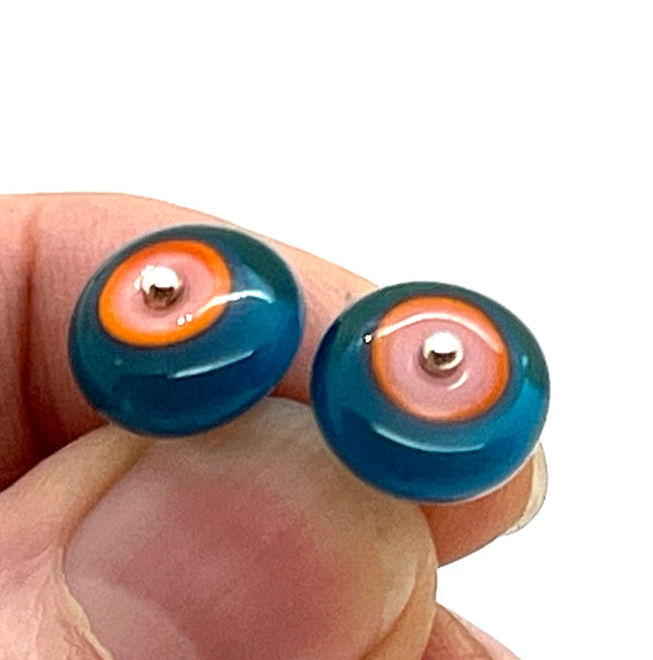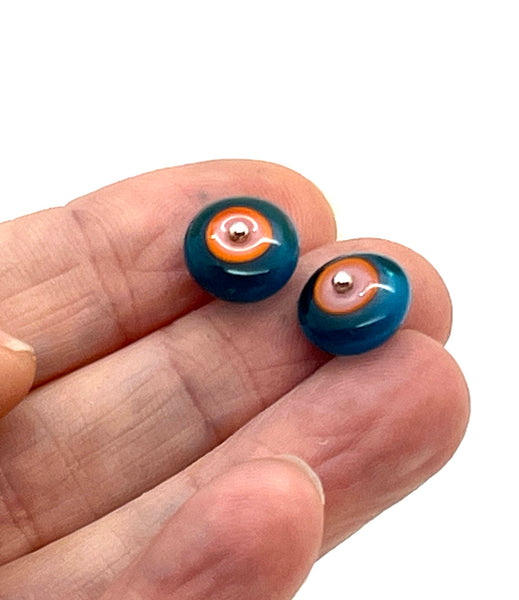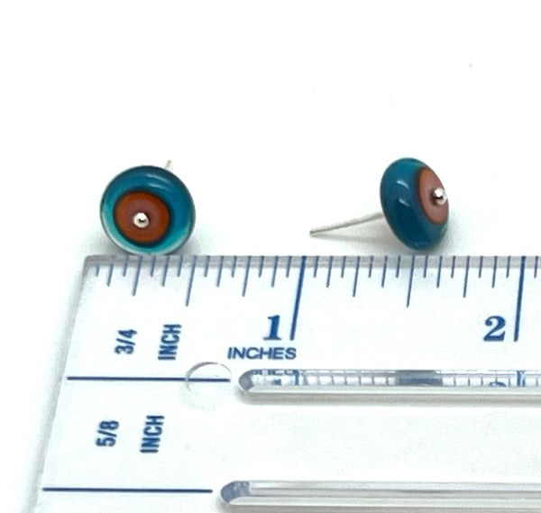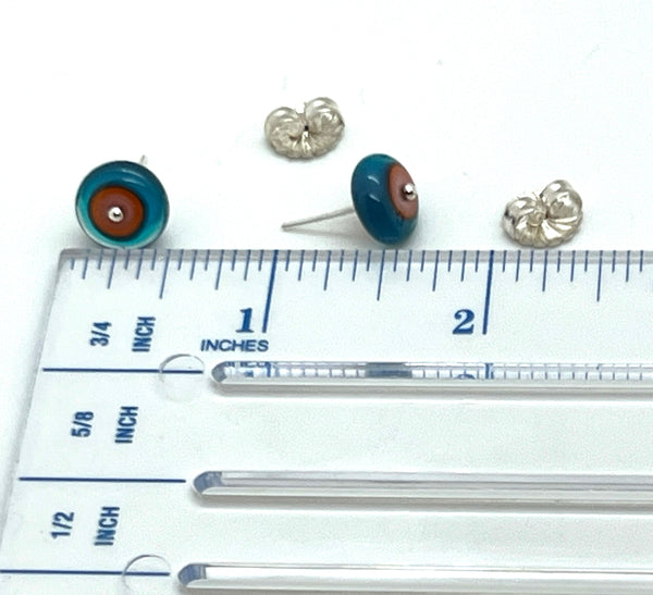 Lamp worked glass disks made by me are mounted to sterling silver studs. My stud earrings are big sellers at my shows. These are smaller than what I typically make in the multi colored circle studs. The backs for these earrings are made of sterling silver and they are larger in size to support your earrings so they don't tilt.