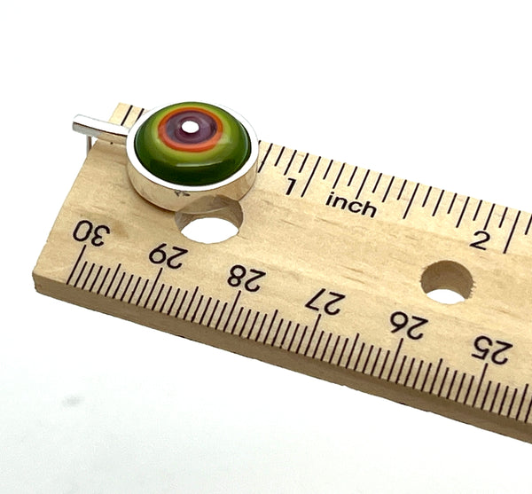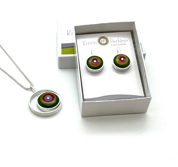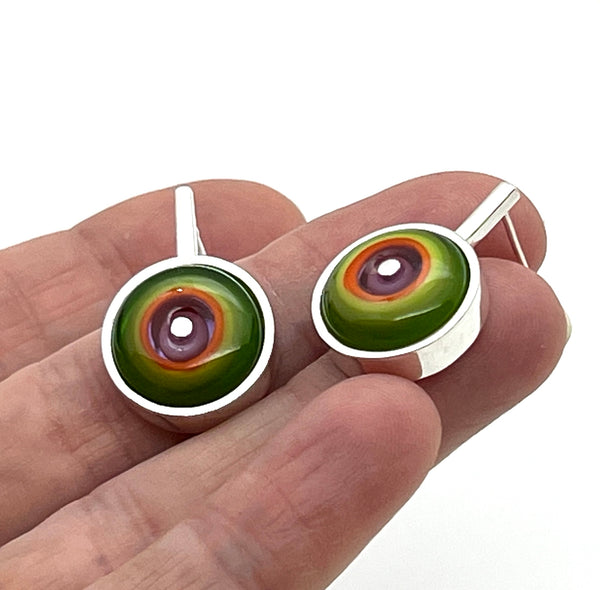 Lampworked glass disks in green, orange, and lavender glass are set into long, modern sterling silver earrings.