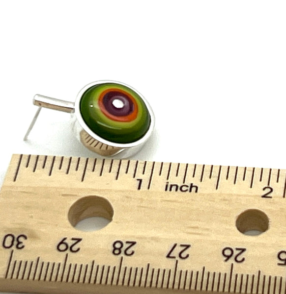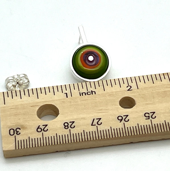 The earrings measure approximately .75” long. The glass and its silver frame measure approximately .65” in diameter.