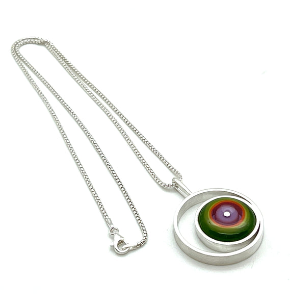 This necklace features a glass disk that I made by layering lavender, orange, and green glass. It is a lovely mix of translucent and transparent glass.