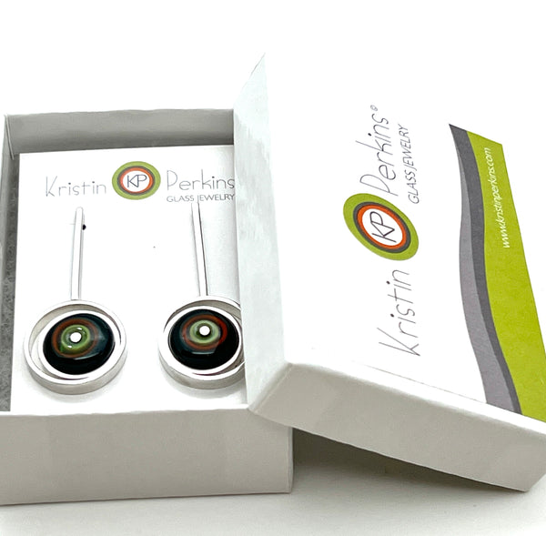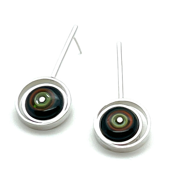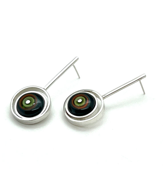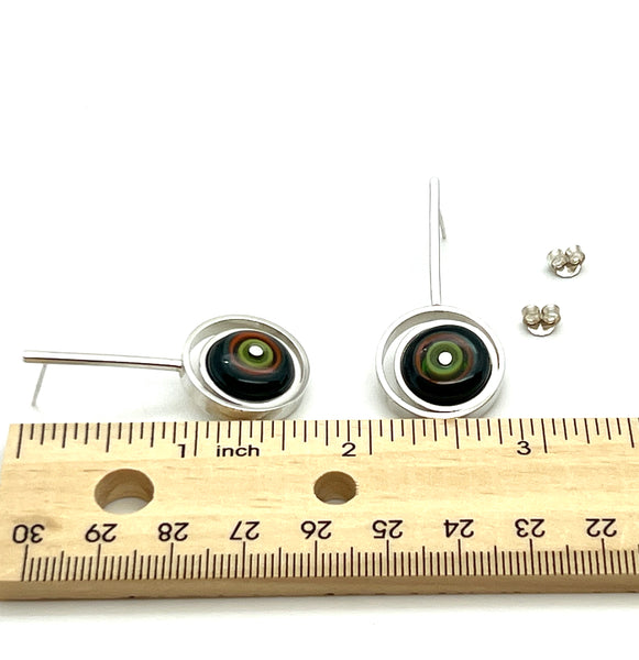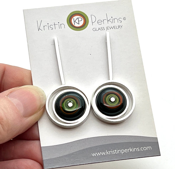 Lampworked glass disks are set into long, modern sterling silver earrings.