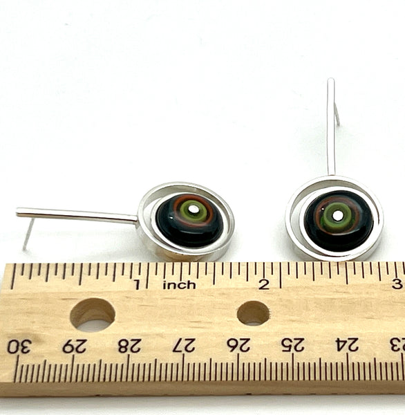 Offset Circle Long Stud Earrings in Green, Orange, and Deep Bottle Green Glass and Sterling Silver