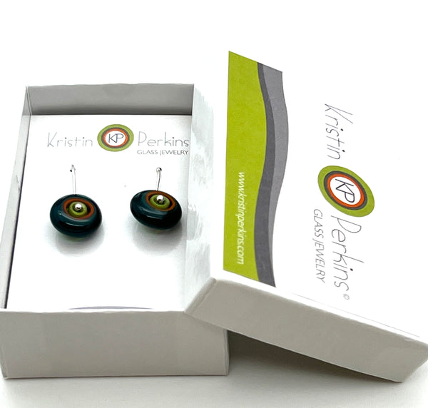 This color scheme features boldly contrasting green, orange, teal, and deep bottle green glass. I make the flameworked glass disks myself and I also make the sterling silver ear wires.