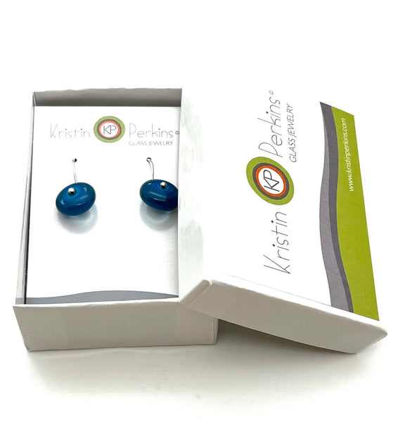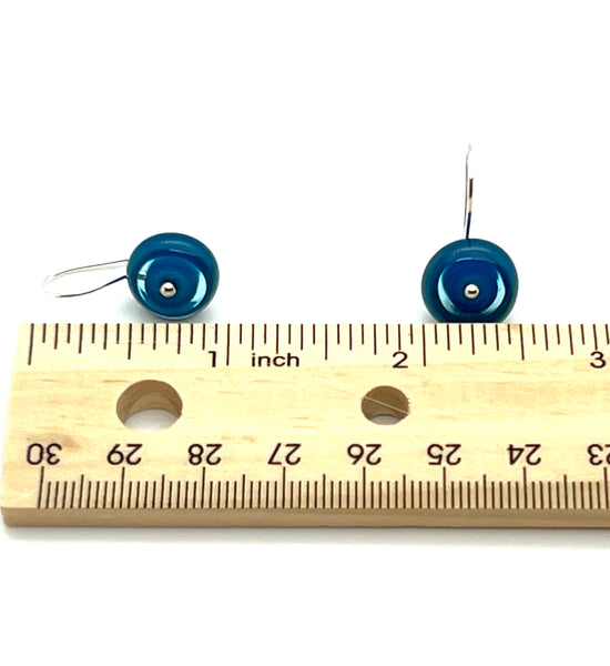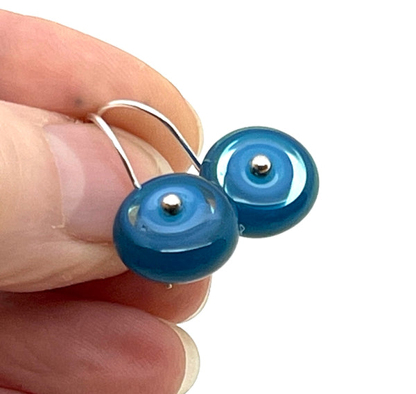 This color scheme features shimmering shades of turquoise, blue, and steel blue glass. I make the flameworked glass disks myself and I also make the sterling silver ear wires.